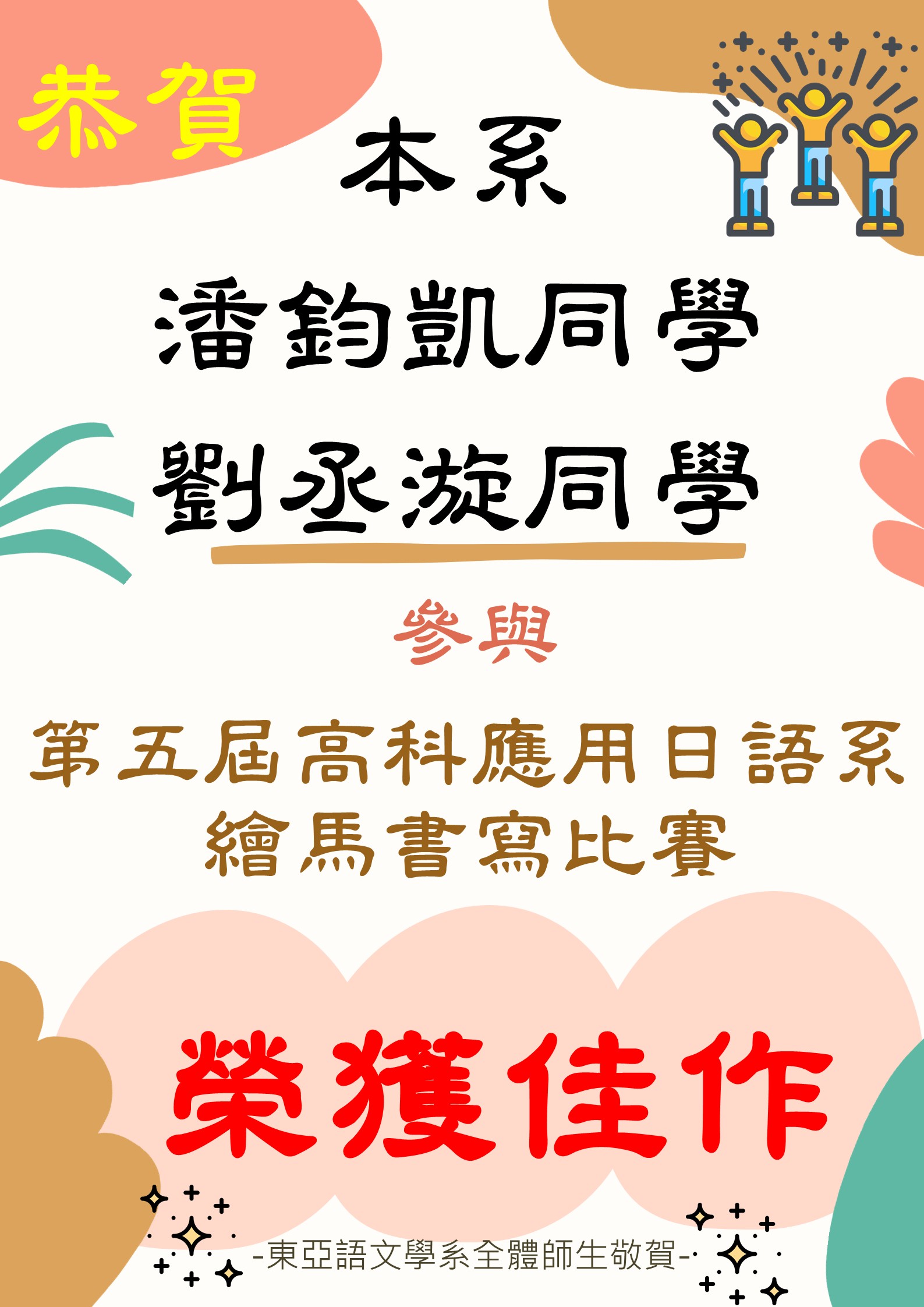 【恭賀】本系潘鈞凱、劉丞漩同學參與第五屆高科應用日語系繪馬書寫比賽榮獲佳作